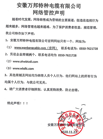 鄭重聲明:安徽萬邦特種電纜有限公司官方網站為:www_wanbangcable_com.adahpes.cn,除此之外無任何子網站或合作網站,其余均為假冒偽劣。電話:0550-7621728 13485756353 地 址:安徽省天長市滁州高新技術產業開發區經四路29號